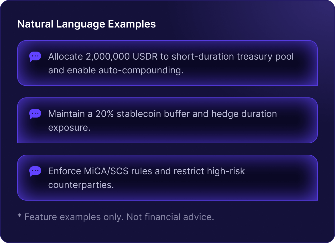Turn static yields into programmable capital flows. An MCP-driven multi-agent system — Strategy, Execution, Risk, Compliance — that continuously compounds, rebalances, routes liquidity, and enforces compliance.